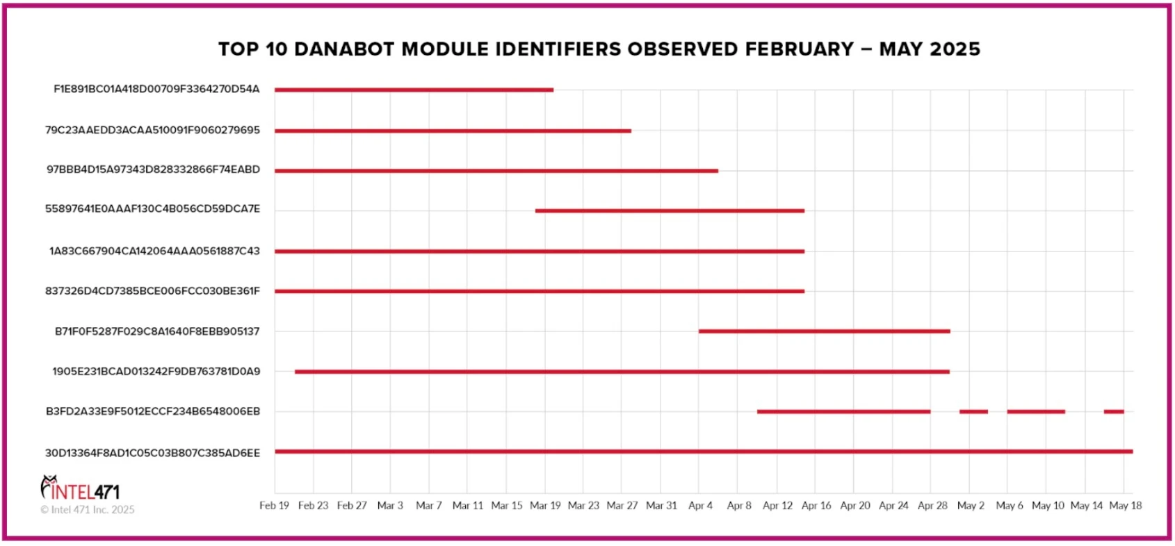 The top 10 DanaBot module identifiers observed between February and May 2025.