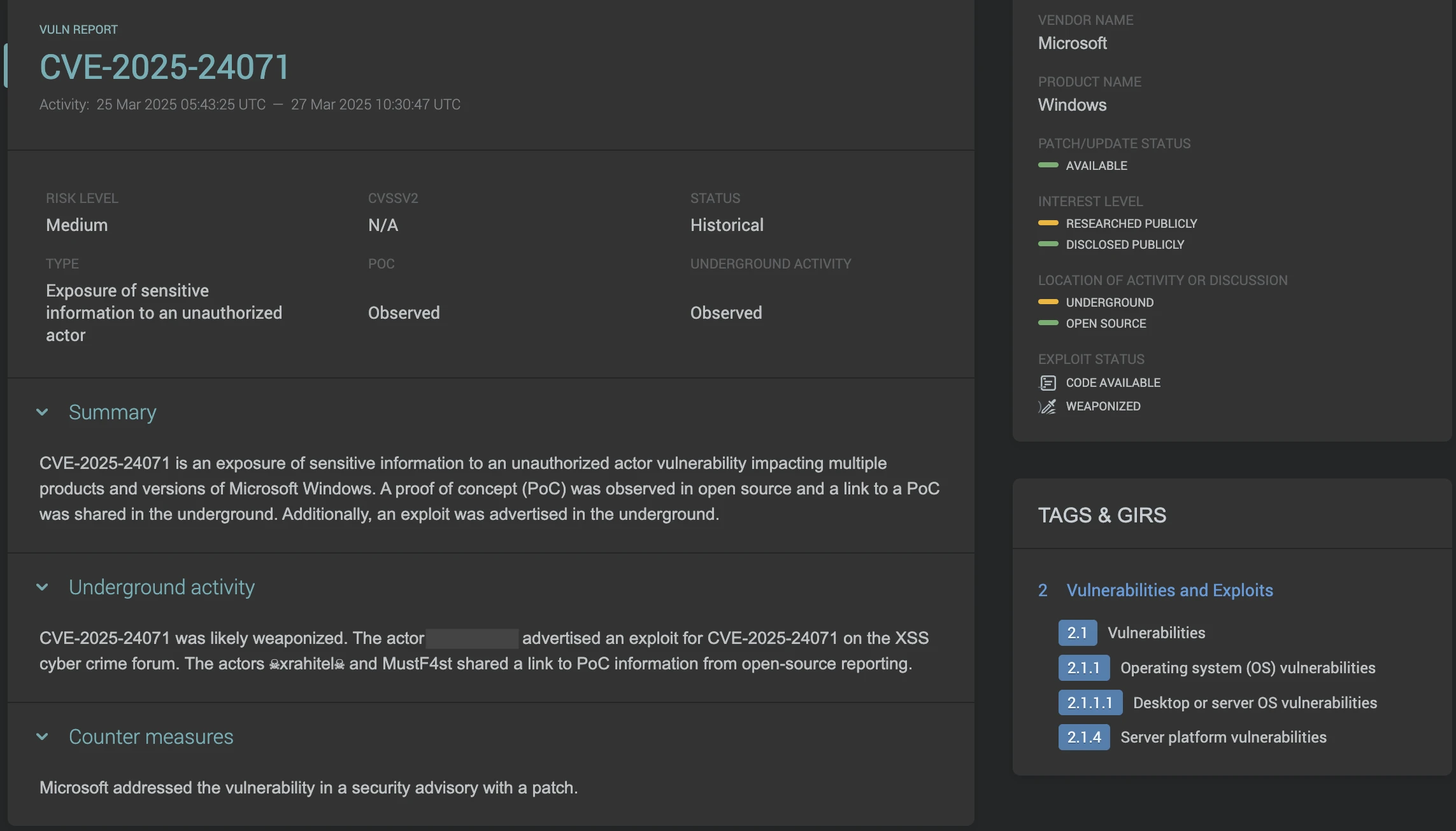 Monitors threat actor discussions, interest levels, exploit development, and buying/selling activity signaling weaponization and productization is imminent