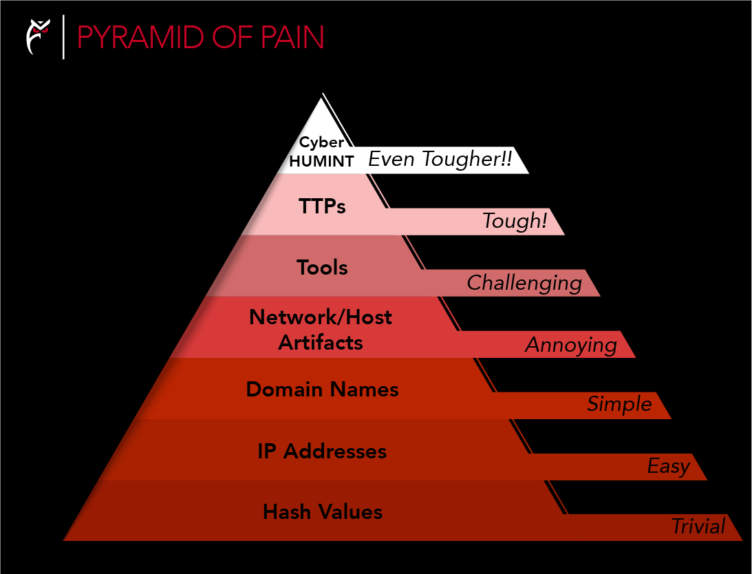 Understanding the imperative of cyber HUMINT starts with revisiting the Pyramid of Pain — a useful tool to conceptualize the inverse relationship between the novelty of adversary indicators and their associated value to a defender. Simply put, the indicators at the base of the pyramid are straightforward to collect and therefore possess lesser value when compared to the categories at the top where adversary indicators are difficult to collect but the resulting intelligence value is greater. Cyber HUMINT is perched at the very top of the pyramid due to its ability to elicit exclusive and proactive insights from adversaries divulging their motives, tactics, plans, tools and more.