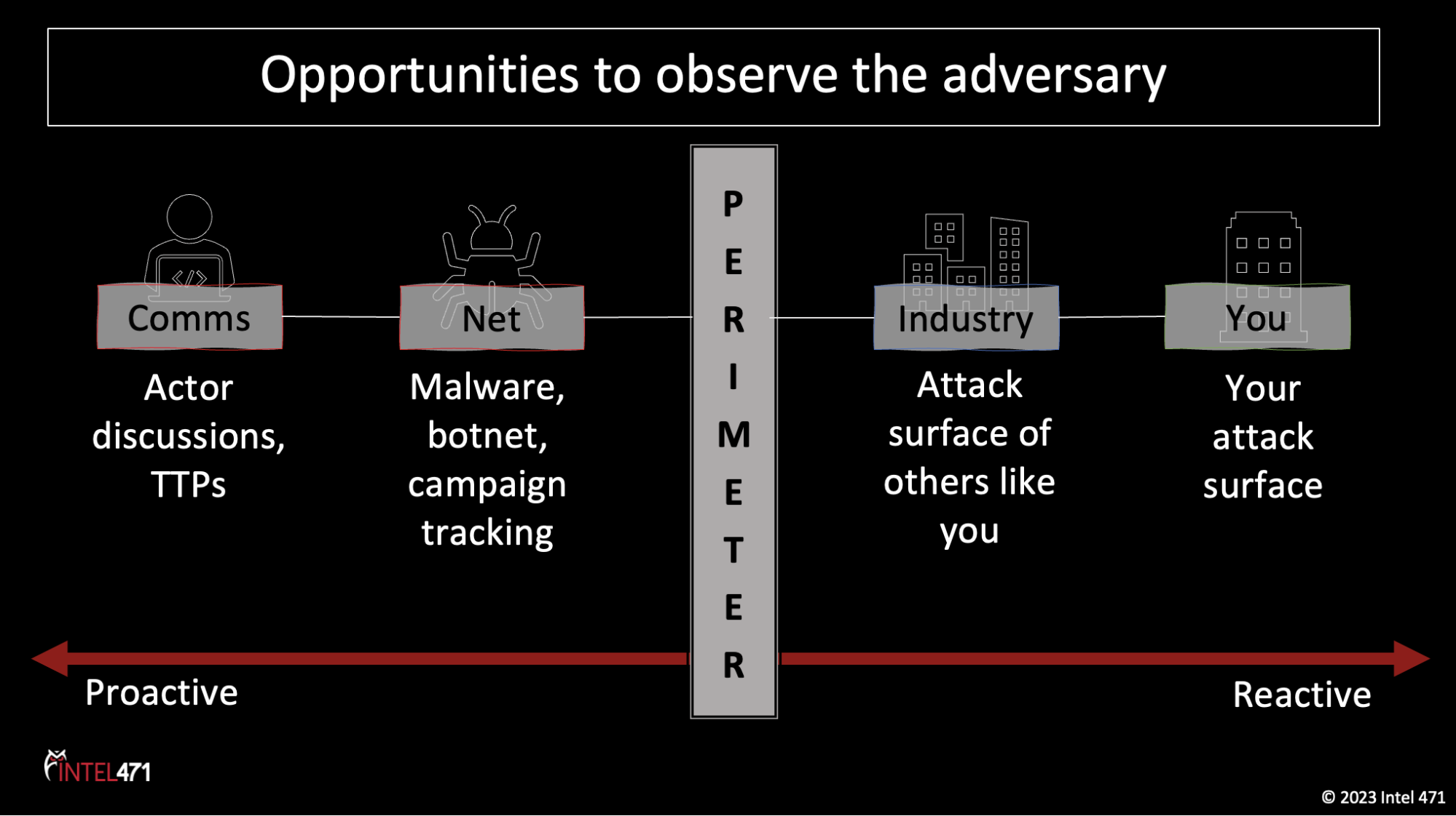 Another way to think about the value of cyber HUMINT is by placing it on the sliding scale of proactive versus reactive threat intelligence gathering. A reactive threat intelligence approach relies heavily on post-attack indicators after an adversary has already targeted the organization or industry vertical, primarily focused on the lower part of the Pyramid of Pain where indicators like IP addresses and hashes are plentiful but not super useful. Conversely, a proactive stance establishes consistent coverage of adversaries before they impact the organization by infiltrating their planning stages and focusing on the behaviors, capabilities, intent, and motivations that precede attacks. Cyber HUMINT is an important component to this proactive intelligence gathering approach, providing “eyes and ears” visibility into pre-attack signals that would otherwise go undetected.