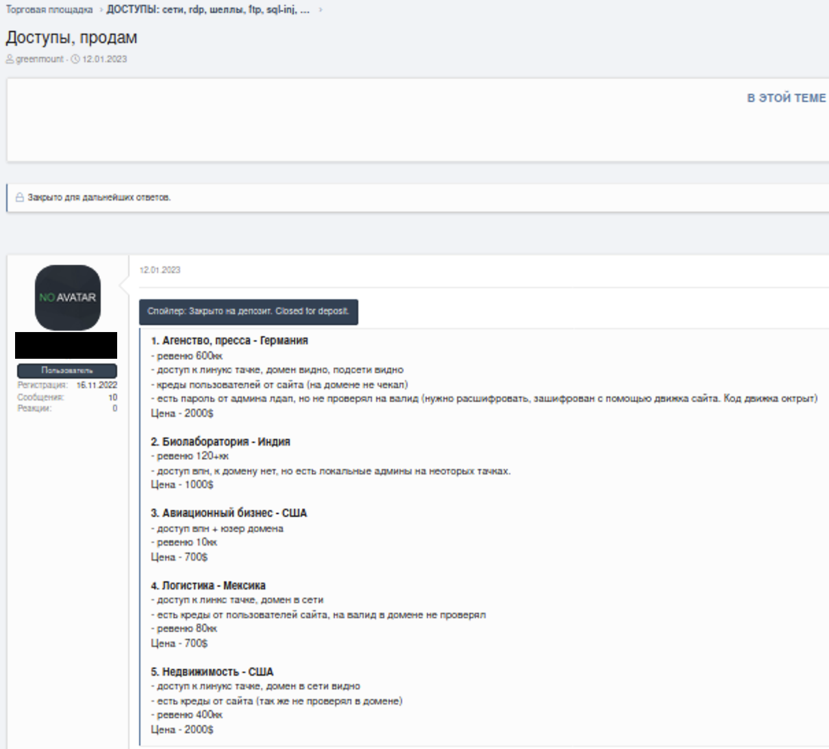 As the figure above illustrates, threat actors are specifically vague for operational security (OPSEC) purposes, preventing forum scraping from being successful in identifying key information that can be used by a defender. This specific advertisement titled “Selling Accesses” allegedly offered for sale remote access credentials to multiple undisclosed organizations worldwide. It is common for threat actors to loosely describe victims by industry, geography and annual revenue, and only reveal more identifying details in private messages with trusted contacts, which could be HUMINT source.