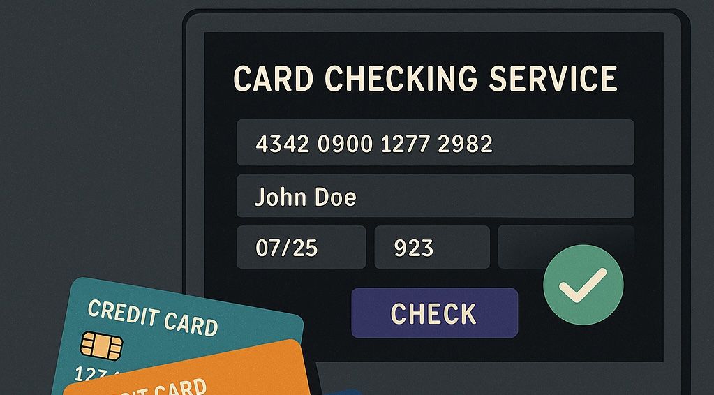 A screenshot of a checker service that provides an application programming interface (API) and web interface and allows users to validate payment card credentials in CNP data or dump format.