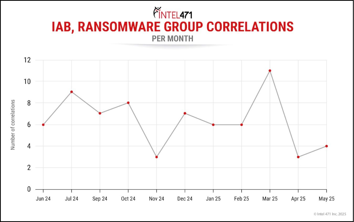 The number of correlations between IABs and ransomware and data extortion groups per month from June 2024 to May 2025.