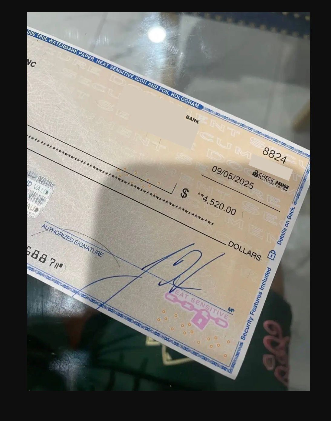 The image depicts a screenshot of a check circulating in the underground on Sept. 5, 2025, that shows several security features, which include watermarked paper, a foil hologram and a heat sensitive icon.