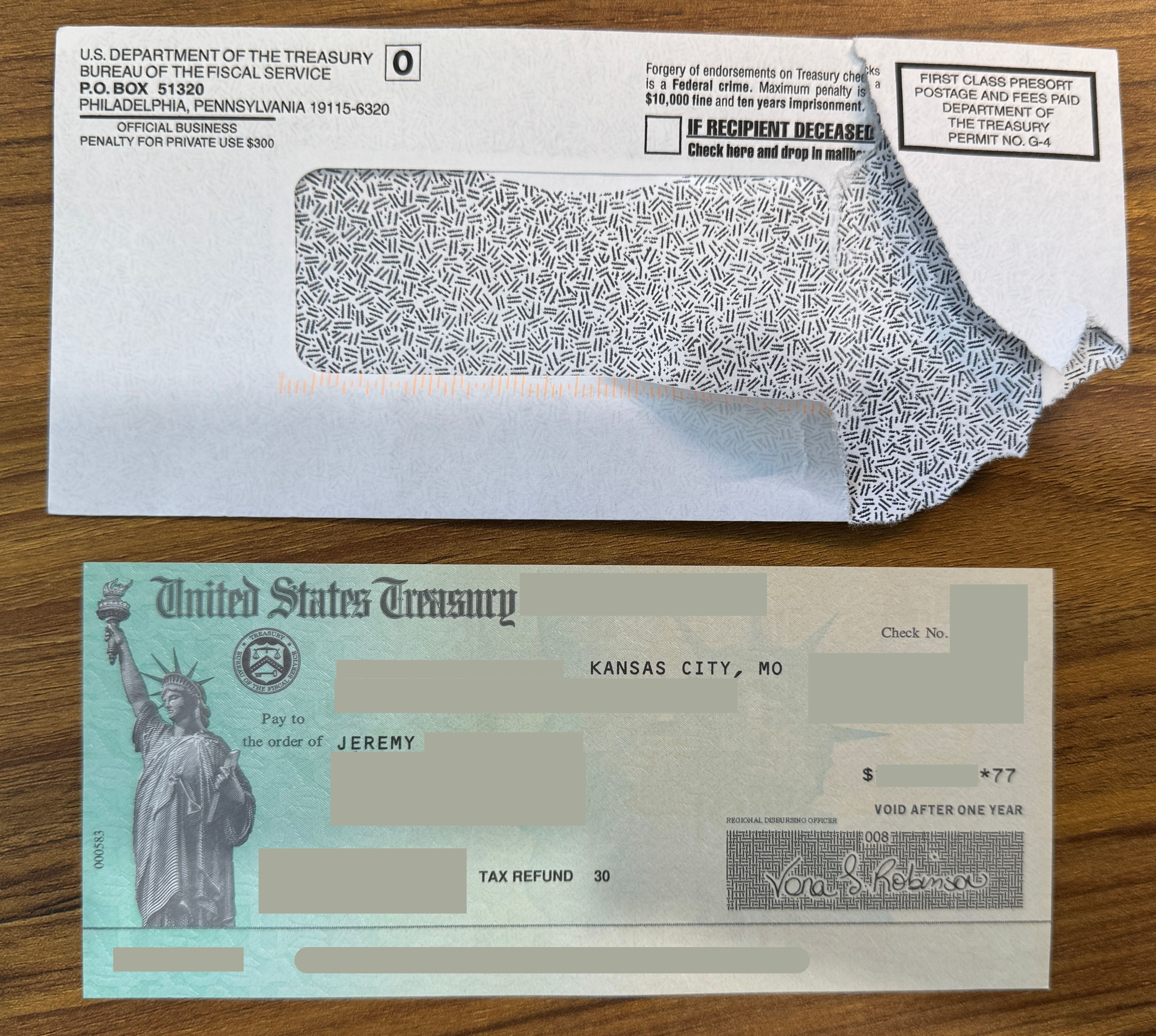 The image depicts a check cut from the U.S. Treasury for a tax refund and its accompanying envelope.