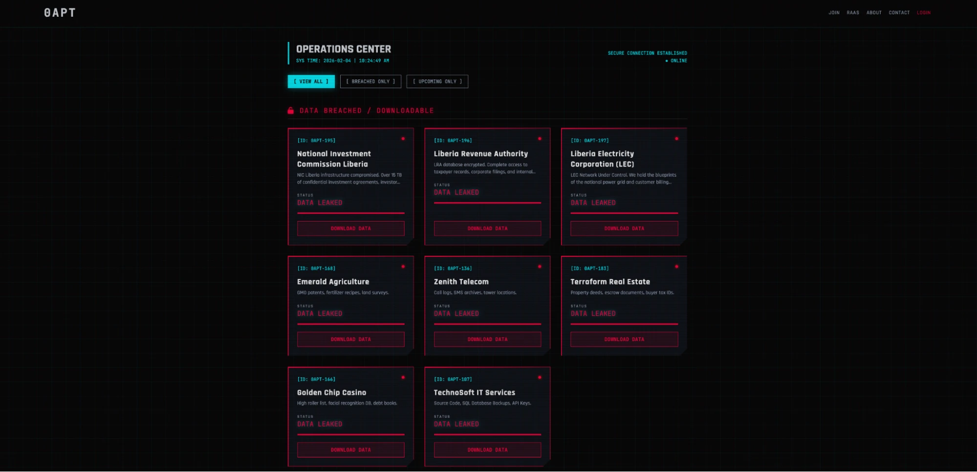 The threat actor 0APT appeared in January 2026 and within only a few days claimed more than 150 victims via its DLS on a Tor-based domain. However, it quickly became clear that many of the alleged victims could not be verified and appeared to be artificially generated.