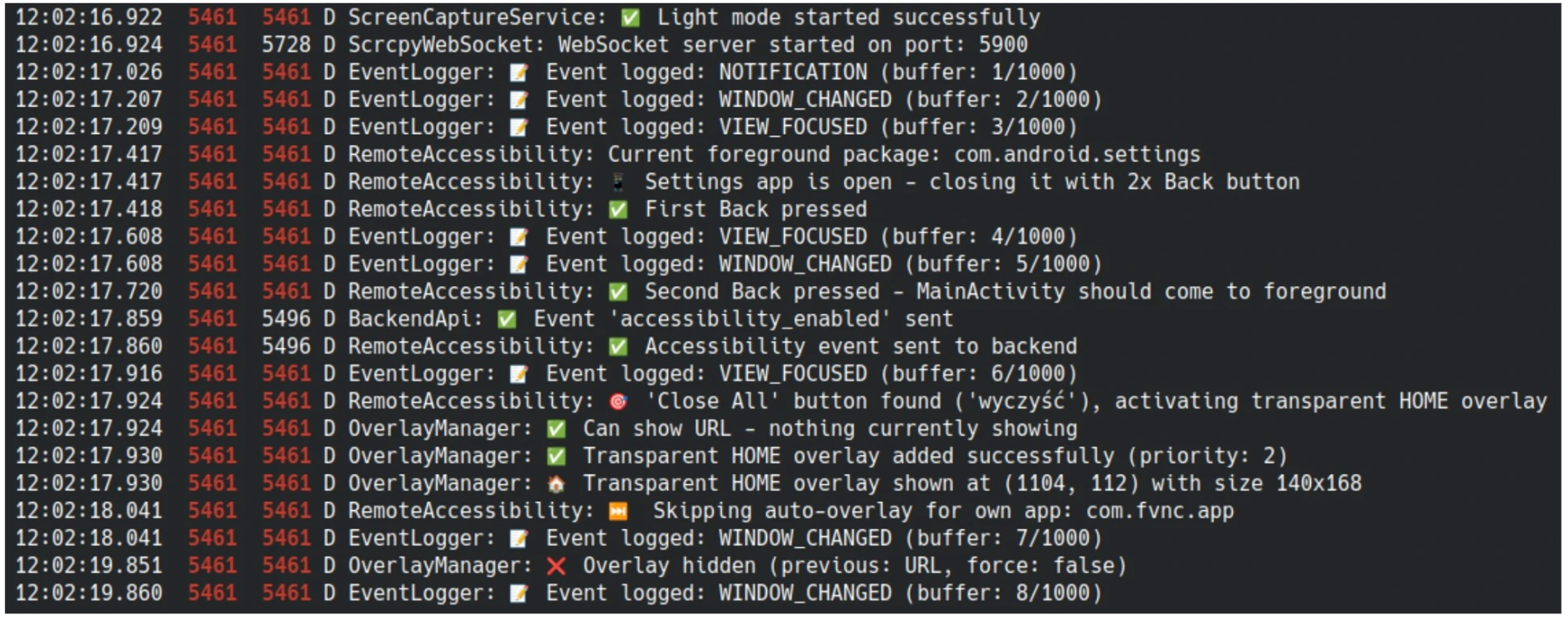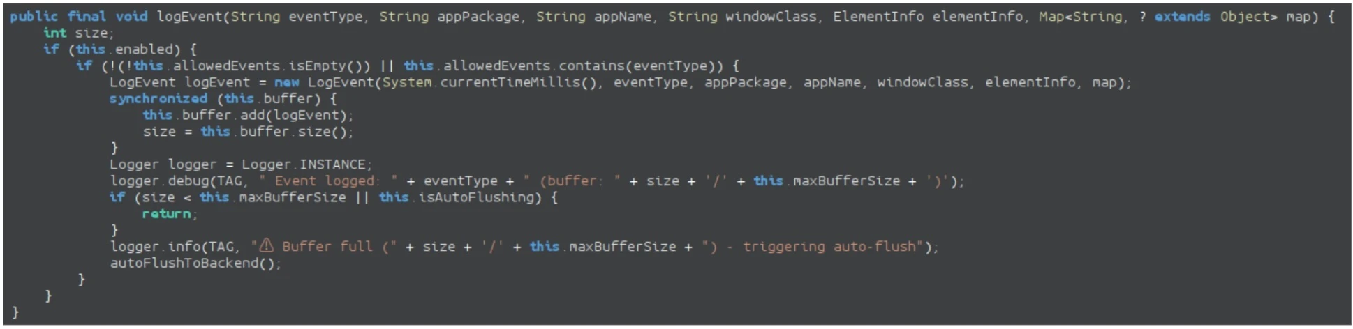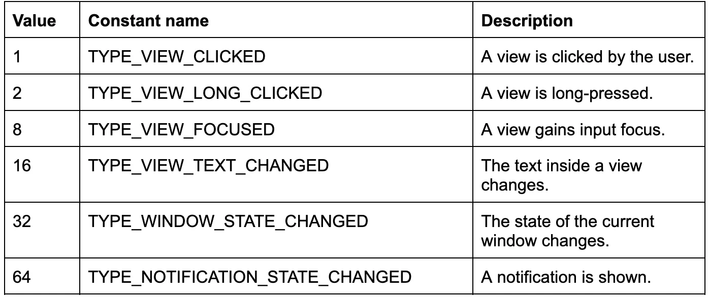 The FvncBot malware abused accessibility services to implement the keylogging feature, allowing it to silently spy on the infected user. The threat actors were able to sniff data from the text fields to capture sensitive data such as passwords or one-time password (OTP) codes. The captured events were logged in a buffer of fixed size (1,000 items) and exfiltrated in a batch with an HTTP request once the buffer limit was reached. Additionally, the bot was able to send an event log with no delay if the WebSocket connection had been established. The supported list of accessibility events captured with the keylogging module includes: