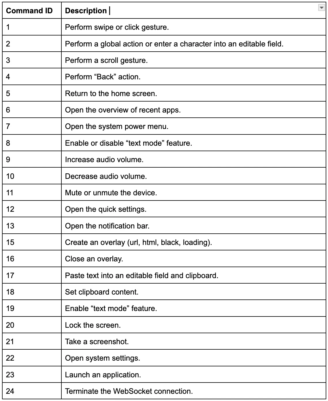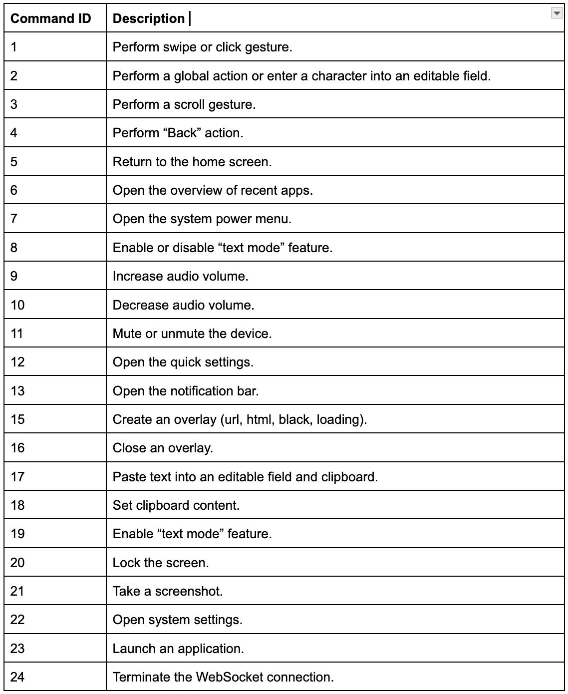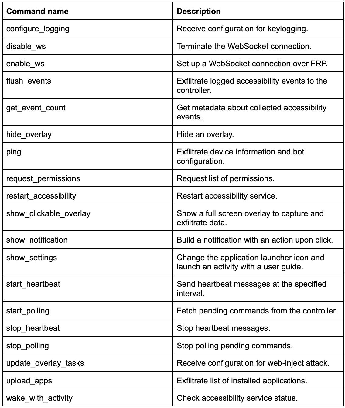 The threat actors were able to remotely control the infected device by sending commands over a WebSocket connection. With support for different gesture events, such as swipe, click or scroll, the actors could easily navigate through the infected device screen. They could launch an application and enter arbitrary data into editable text fields as well as the clipboard. To cover their illicit activities, the device could be locked, muted and a black overlay displayed until the fraud was complete. A list of remote actions available to the bot operator includes: