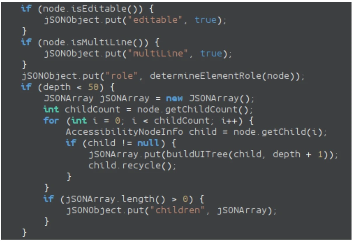 Apart from the screen streaming feature, the bot featured a so-called βtext mode,β commonly referred to as HVNC. This feature allowed the actors to thoroughly inspect the device screen layout and content even if the targeted application prevented taking screenshots with the FLAG_SECURE setting. By abusing accessibility services, the malware recursively created a JSON object of a user interface (UI) element with its children and transmitted data to the control server for full screen reconstruction. The following figure depicts a piece of code to capture a full device UI tree.βββββο»Ώβο»Ώββββββο»Ώο»Ώβο»Ώβββββββββο»Ώββββββο»Ώββββββο»Ώβββββββο»Ώβο»Ώββββββο»Ώββββββο»Ώβββο»Ώββββο»Ώβββββββο»Ώο»Ώββββββο»Ώββββββββββο»Ώβββββββββββββββο»Ώβββββββββββο»Ώβββο»Ώβββο»Ώβββο»Ώβο»Ώβο»Ώββββο»Ώο»Ώββο»Ώο»Ώββββββο»Ώββο»Ώββββββββο»Ώββο»Ώβββο»Ώβο»Ώβο»Ώββββο»Ώββο»Ώβο»Ώββββββο»Ώββββββο»Ώβββο»Ώββββο»Ώββο»Ώβο»Ώβο»Ώβββο»Ώββββββββββββο»Ώο»Ώββο»Ώο»Ώββββββο»Ώββο»Ώββββββββο»Ώββο»Ώββββο»Ώο»Ώβββββββββββββο»Ώββββο»Ώο»Ώββο»Ώβββο»Ώο»Ώβββββββββο»Ώο»Ώββο»Ώβββο»Ώβββββββο»Ώβο»Ώββββββο»Ώββο»Ώβββββββο»Ώββββββββο»Ώο»Ώββο»Ώββο»Ώβο»Ώβββββββββο»Ώο»Ώββο»Ώβββββββο»Ώβββββο»Ώβο»Ώβο»Ώβο»Ώβββο»Ώβββο»Ώββββο»Ώββο»Ώβββββο»Ώβο»Ώβββο»Ώββββο»Ώββο»Ώβββββο»Ώβο»Ώβββο»Ώβο»Ώββο»Ώββο»Ώβββο»Ώβββο»Ώβο»Ώββββββο»Ώββο»Ώβββο»Ώβββββο»Ώβο»Ώβββββββββββο»Ώβββο»Ώβββο»Ώβο»Ώβββββο»Ώβββο»Ώβο»Ώβο»Ώβο»Ώβο»Ώβββο»Ώβββο»Ώβββββββο»Ώο»Ώβββββββο»Ώβββο»Ώο»Ώβββο»Ώβο»Ώβο»Ώβο»Ώβββββββο»Ώβββββββο»Ώο»Ώββο»Ώβββββββββο»Ώβββββββββο»Ώββββββββο»Ώββββββββββο»Ώβββββββο»Ώββββββββο»Ώο»Ώβββο»Ώβββββο»Ώβββββββο»Ώβο»Ώβββββββββο»Ώβο»Ώβββββββββο»Ώβββο»Ώβββο»Ώβββββββββο»Ώβο»Ώβββββββο»Ώβββο»Ώβββο»Ώβο»Ώβο»Ώβββο»Ώβββο»Ώβββββββββββο»Ώβββο»Ώβββββββο»Ώββββββββο»Ώββο»Ώβββββββββο»Ώβββββββββββββο»Ώβββο»Ώβββββββο»Ώββββββββο»Ώο»Ώβββο»Ώβββββο»Ώβββββββο»Ώβο»Ώβββββββββο»Ώβο»Ώβββββββββο»Ώβββο»Ώβββο»Ώβββο»Ώβο»Ώβββο»Ώβββββο»Ώβββο»Ώβο»Ώβββο»Ώβββββο»Ώβο»Ώβο»Ώβββο»Ώβββββββββββο»Ώβββο»Ώβββββββο»Ώββββββββο»Ώββββο»Ώββββββββββο»Ώββββββο»Ώββββββββο»Ώββββββο»Ώββββββββο»Ώο»Ώβββο»Ώβββββο»Ώβββββββο»Ώβο»Ώβββββββββο»Ώβο»Ώβββββββββο»Ώβββο»Ώβββββββββββο»Ώβββο»Ώβββο»Ώβο»Ώβο»Ώβββββββο»Ώβββββββββββββββο»Ώβββββββο»Ώβββο»Ώβββββββο»Ώββββββββο»Ώββο»Ώβββββββο»Ώβββο»Ώβββο»Ώο»Ώο»Ώβββββββββο»Ώβο»Ώβββββββββο»Ώββββο»Ώββο»Ώο»Ώββββββο»Ώβββο»Ώβββο»Ώβββο»Ώβο»Ώβββββο»Ώβο»Ώβββββββββο»Ώβββββββββββο»Ώββββββββββββο»Ώββο»Ώββββββββο»Ώββο»Ώβββο»Ώβο»Ώβο»Ώββββο»Ώββο»Ώβο»Ώββββββο»Ώββββββο»Ώβββο»Ώββββο»Ώββο»Ώβο»Ώβο»Ώβββο»Ώββββββββββββο»Ώο»Ώβββββββββββββο»Ώο»Ώββο»Ώβββββββο»Ώβββββο»Ώβο»Ώβο»Ώβο»Ώβββο»Ώβββο»Ώββββο»Ώββο»Ώβββββο»Ώβο»Ώβββο»Ώββββο»Ώββο»Ώβββββο»Ώβο»Ώβββο»Ώβο»Ώββο»Ώββο»Ώβββο»Ώβββο»Ώβο»Ώββββββο»Ώββο»Ώβββο»Ώβββββο»Ώβο»Ώβββββββββββο»Ώβββο»Ώβββο»Ώβο»Ώβββββο»Ώβββο»Ώβο»Ώβββββο»Ώβββο»Ώβββο»Ώβββββββο»Ώο»Ώβββββββο»Ώβββο»Ώο»Ώβββο»Ώβββββο»Ώβββββββο»Ώβββββββο»Ώο»Ώββο»Ώβββββββββο»Ώβββββββββο»Ώββββββββο»Ώββββββββββο»Ώβββββββο»Ώββββββββο»Ώο»Ώβββο»Ώβββββο»Ώβββββββο»Ώβο»Ώβββββββββο»Ώβο»Ώβββββββββο»Ώβββο»Ώβββο»Ώβββββββββο»Ώβο»Ώβββββββο»Ώβββο»Ώβββο»Ώβο»Ώβο»Ώβββο»Ώβββο»Ώβββββββββββο»Ώβββο»Ώβββββββο»Ώββββββββο»Ώββο»Ώβββββββββο»Ώβββββββββββββο»Ώβββο»Ώβββββββο»Ώββββββββο»Ώο»Ώβββο»Ώβββββο»Ώβββββββο»Ώβο»Ώβββββββββο»Ώβο»Ώβββββββββο»Ώβββο»Ώβββο»Ώβββο»Ώβο»Ώβββο»Ώβββββο»Ώβββο»Ώβο»Ώβββο»Ώβββββο»Ώβο»Ώβο»Ώβββο»Ώβββββββββββο»Ώβββο»Ώβββββββο»Ώββββββββο»Ώββββο»Ώββββββββββο»Ώββββββο»Ώββββββββο»Ώββββββο»Ώββββββββο»Ώο»Ώβββο»Ώββββ