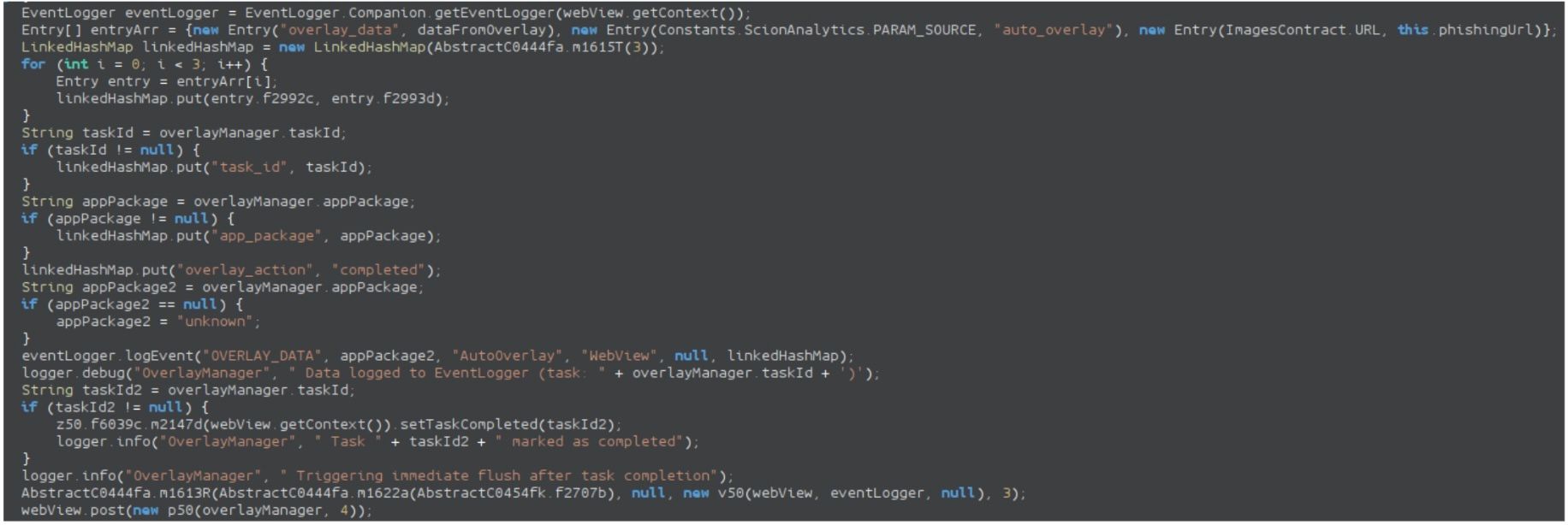 The malware was capable of performing web-inject attacks to trick victims into providing personal or banking information. A list of targeted applications, their configurations and phishing page URLs were received from the controller and saved locally in a shared preferences file. Once an application from the list was launched, the bot created an overlay window and loaded a phishing lure from a remote location in a WebView component. A custom JavaScript interface served as a bridge to the application, allowing the bot to harvest and exfiltrate data to the controller after the victim submitted their credentials. The malware code snippet used to log the collected data is depicted in the figure below.βββββο»Ώβο»Ώββββββο»Ώο»Ώβο»Ώβββββββββο»Ώββββββο»Ώββββββο»Ώβββββββο»Ώβο»Ώββββββο»Ώββββββο»Ώβββο»Ώββββο»Ώβββββββο»Ώο»Ώββββββο»Ώββββββββββο»Ώβββββββββββββββο»Ώβββββββββββο»Ώβββο»Ώβββο»Ώβββο»Ώβο»Ώβο»Ώββββο»Ώο»Ώββο»Ώο»Ώββββββο»Ώββο»Ώββββββββο»Ώββο»Ώβββο»Ώβο»Ώβο»Ώββββο»Ώββο»Ώβο»Ώββββββο»Ώββββββο»Ώβββο»Ώββββο»Ώββο»Ώβο»Ώβο»Ώβββο»Ώββββββββββββο»Ώο»Ώββο»Ώο»Ώββββββο»Ώββο»Ώββββββββο»Ώββο»Ώββββο»Ώο»Ώβββββββββββββο»Ώββββο»Ώο»Ώββο»Ώβββο»Ώο»Ώβββββββββο»Ώο»Ώββο»Ώβββο»Ώβββββββο»Ώβο»Ώββββββο»Ώββο»Ώβββββββο»Ώββββββββο»Ώο»Ώββο»Ώββο»Ώβο»Ώβββββββββο»Ώο»Ώββο»Ώβββββββο»Ώβββββο»Ώβο»Ώβο»Ώβο»Ώβββο»Ώβββο»Ώββββο»Ώββο»Ώβββββο»Ώβο»Ώβββο»Ώββββο»Ώββο»Ώβββββο»Ώβο»Ώβββο»Ώβο»Ώββο»Ώββο»Ώβββο»Ώβββο»Ώβο»Ώββββββο»Ώββο»Ώβββο»Ώβββββο»Ώβο»Ώβββββββββββο»Ώβββο»Ώβββο»Ώβο»Ώβββββο»Ώβββο»Ώβο»Ώβο»Ώβο»Ώβο»Ώβββο»Ώβββο»Ώβββββββο»Ώο»Ώβββββββο»Ώβββο»Ώο»Ώβββο»Ώβο»Ώβο»Ώβο»Ώβββββββο»Ώβββββββο»Ώο»Ώββο»Ώβββββββββο»Ώβββββββββο»Ώββββββββο»Ώββββββββββο»Ώβββββββο»Ώββββββββο»Ώο»Ώβββο»Ώβββββο»Ώβββββββο»Ώβο»Ώβββββββββο»Ώβο»Ώβββββββββο»Ώβββο»Ώβββο»Ώβββββββββο»Ώβο»Ώβββββββο»Ώβββο»Ώβββο»Ώβο»Ώβο»Ώβββο»Ώβββο»Ώβββββββββββο»Ώβββο»Ώβββββββο»Ώββββββββο»Ώββο»Ώβββββββββο»Ώβββββββββββββο»Ώβββο»Ώβββββββο»Ώββββββββο»Ώο»Ώβββο»Ώβββββο»Ώβββββββο»Ώβο»Ώβββββββββο»Ώβο»Ώβββββββββο»Ώβββο»Ώβββββο»Ώβο»Ώβββο»Ώβββο»Ώβββο»Ώβββο»Ώβββο»Ώβββο»Ώβο»Ώβββββο»Ώβββββββββββββββο»Ώβββο»Ώβββββββο»Ώββββββββο»Ώββββο»Ώββββββββββο»Ώββββββο»Ώββββββββο»Ώββββββο»Ώββββββββο»Ώο»Ώβββο»Ώβββββο»Ώβββββββο»Ώβο»Ώβββββββββο»Ώβο»Ώβββββββββο»Ώβββο»Ώβββο»Ώβββο»Ώβββο»Ώβο»Ώβο»Ώβββο»Ώβββο»Ώβββο»Ώβββο»Ώβββο»Ώβββο»Ώβββο»Ώβββββββββββο»Ώβββο»Ώβββββββο»Ώββββββββο»Ώββο»Ώβββββββο»Ώβββο»Ώβββο»Ώο»Ώο»Ώβββββββββο»Ώβο»Ώβββββββββο»Ώββββο»Ώββο»Ώο»Ώββββββο»Ώβββο»Ώβββο»Ώβββο»Ώβο»Ώβββββο»Ώβο»Ώβββββββββο»Ώβββββββββββο»Ώββββββββββββο»Ώββο»Ώββββββββο»Ώββο»Ώβββο»Ώβο»Ώβο»Ώββββο»Ώββο»Ώβο»Ώββββββο»Ώββββββο»Ώβββο»Ώββββο»Ώββο»Ώβο»Ώβο»Ώβββο»Ώββββββββββββο»Ώο»Ώβββββββββββββο»Ώο»Ώββο»Ώβββββββο»Ώβββββο»Ώβο»Ώβο»Ώβο»Ώβββο»Ώβββο»Ώββββο»Ώββο»Ώβββββο»Ώβο»Ώβββο»Ώββββο»Ώββο»Ώβββββο»Ώβο»Ώβββο»Ώβο»Ώββο»Ώββο»Ώβββο»Ώβββο»Ώβο»Ώββββββο»Ώββο»Ώβββο»Ώβββββο»Ώβο»Ώβββββββββββο»Ώβββο»Ώβββο»Ώβο»Ώβββββο»Ώβββο»Ώβο»Ώβββββο»Ώβββο»Ώβββο»Ώβββββββο»Ώο»Ώβββββββο»Ώβββο»Ώο»Ώβββο»Ώβββββο»Ώβββββββο»Ώβββββββο»Ώο»Ώββο»Ώβββββββββο»Ώβββββββββο»Ώββββββββο»Ώββββββββββο»Ώβββββββο»Ώββββββββο»Ώο»Ώβββο»Ώβββββο»Ώβββββββο»Ώβο»Ώβββββββββο»Ώβο»Ώβββββββββο»Ώβββο»Ώβββο»Ώβββββββββο»Ώβο»Ώβββββββο»Ώβββο»Ώβββο»Ώβο»Ώβο»Ώβββο»Ώβββο»Ώβββββββββββο»Ώβββο»Ώβββββββο»Ώββββββββο»Ώββο»Ώβββββββββο»Ώβββββββββββββο»Ώβββο»Ώβββββββο»Ώββββββββο»Ώο»Ώβββο»Ώβββββο»Ώβββββββο»Ώβο»Ώβββββββββο»Ώβο»Ώβββββββββο»Ώβββο»Ώβββββο»Ώβο»Ώβββο»Ώβββο»Ώβββο»Ώβββο»Ώβββο»Ώβββο»Ώβο»Ώβββββο»Ώβββββββββββββββο»Ώβββο»Ώβββββββο»Ώββββββββο»Ώββββο»Ώβββ