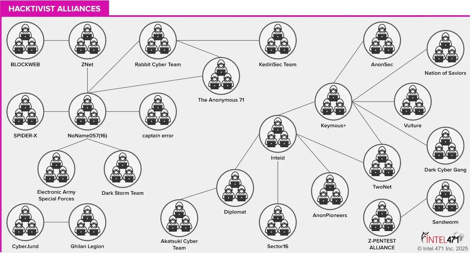 This image depicts a link diagram of new alliances allegedly formed between the monitored hacktivist groups between March 31, 2025, and May 4, 2025.