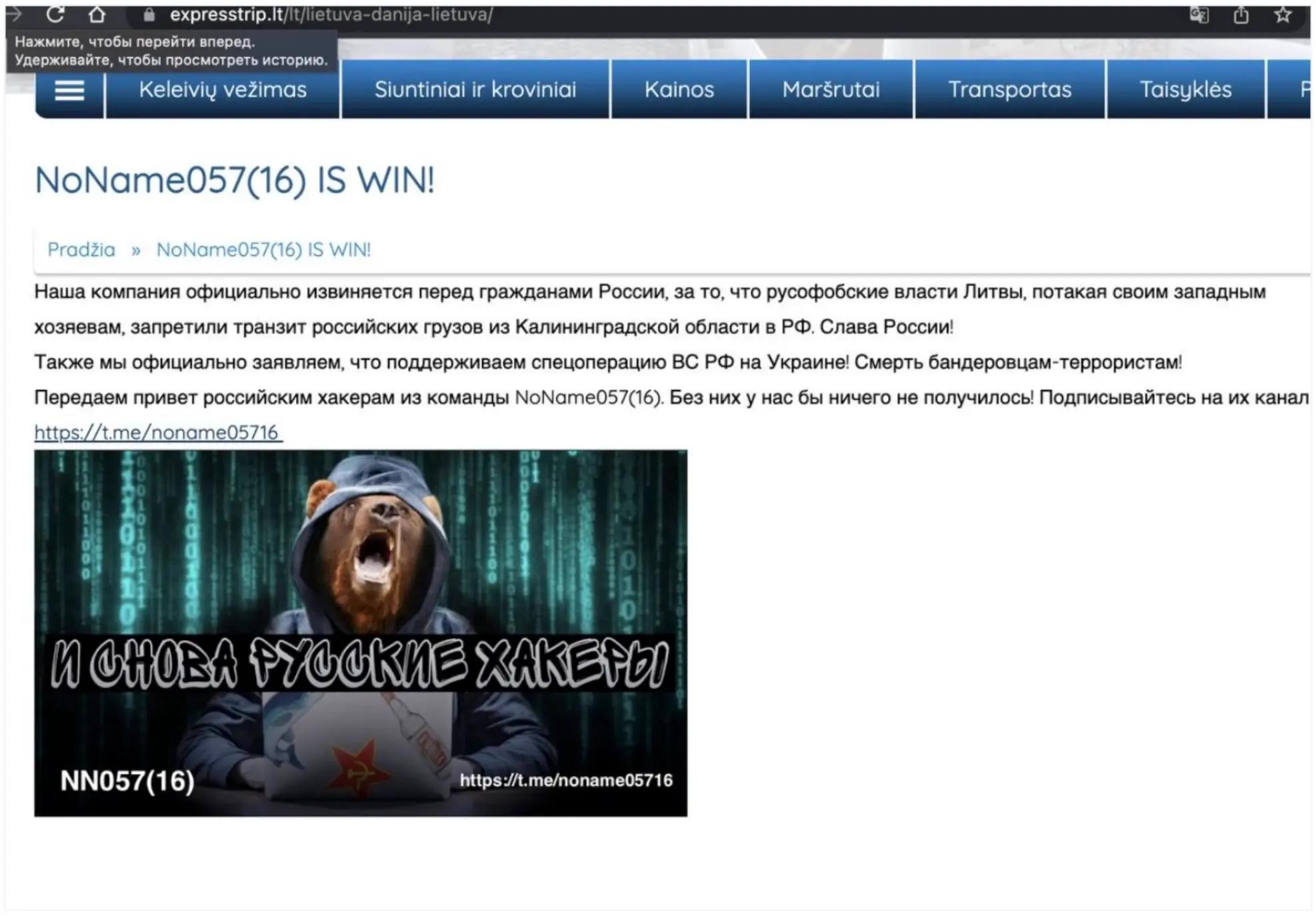 The NoName057(16) group published this screenshot after claiming responsibility for the defacement of the Lithuania-based freight company ExpressTrip July 4, 2022.