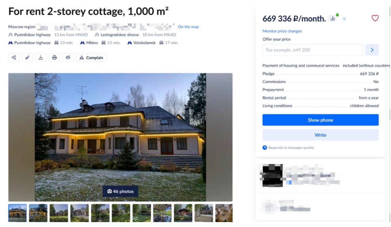 The Russian Yandex Food delivery service data leak in early 2022 revealed several locations where a person by the name Oleg Nefedov ordered food to be delivered. It was not possible to determine whether Nefedov or the actorβs associates owned or just used the properties. This is a residence in the Moscow region, available for rent for 669,336 Russian rubles (about US $7,450) per month as of March 2025.