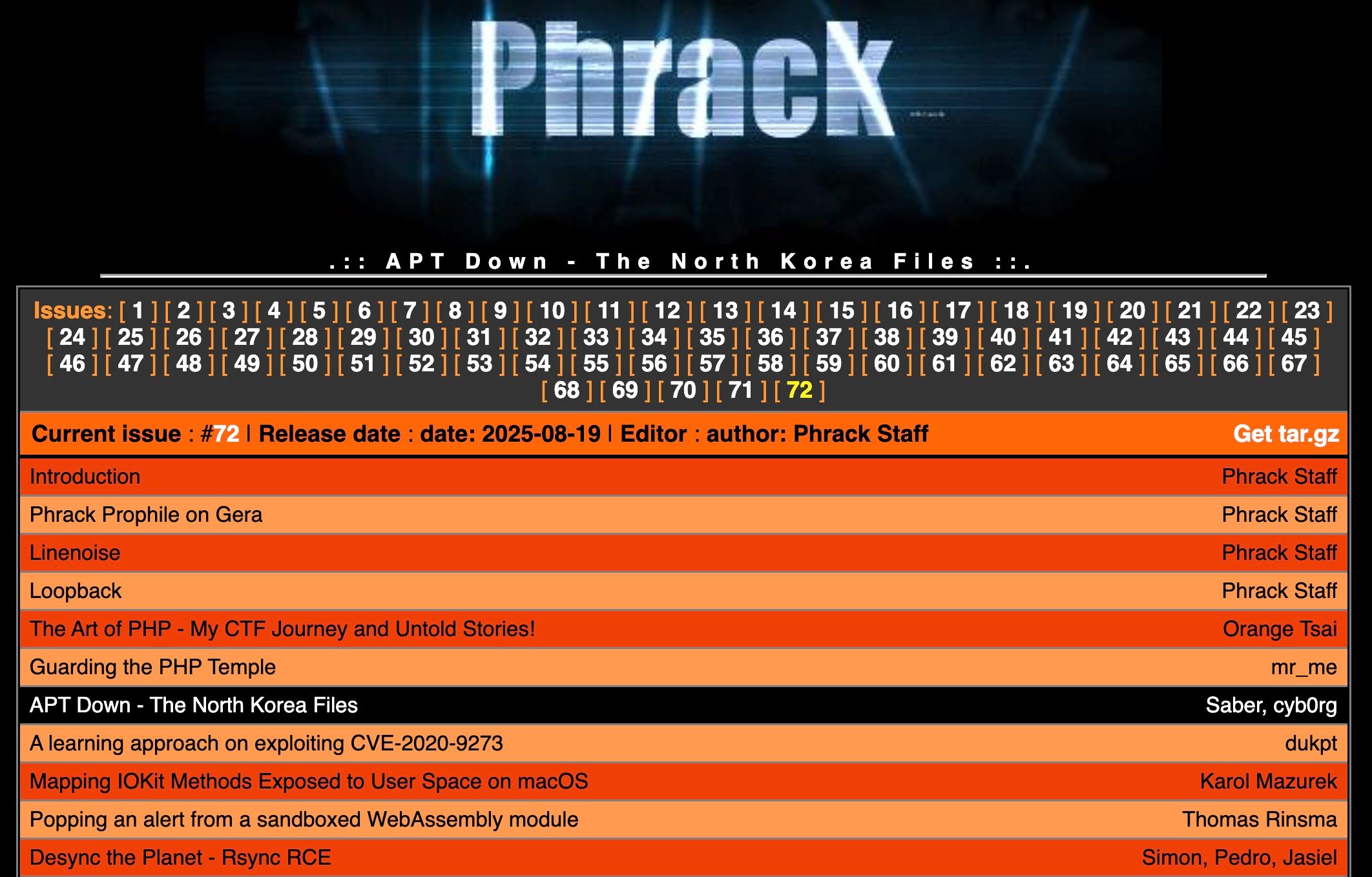 Phrack magazine is a legendary publication launched in November 1985 by the hacking community featuring technical writeups and tales of hacker lore. On Aug. 8, 2025, at the DEF CON hacking convention, Phrack released a hardcopy version of its 72nd issue that marked the publicationβs 40th anniversary. The physical and online release included a lengthy examination of an extensive leak of malware, credentials, hacking tools and configurations in an article titled βAPT Down - The North Korea Files.ββββββο»Ώβο»Ώββββββο»Ώο»Ώβο»Ώβββββββββο»Ώββββββο»Ώββββββο»Ώβββββββο»Ώβο»Ώββββββο»Ώββββββο»Ώβββο»Ώββββο»Ώβββββββο»Ώο»Ώββββββο»Ώββββββββββο»Ώβββββββββββββββο»Ώβββββββββββο»Ώβββο»Ώβββο»Ώβββο»Ώβο»Ώβο»Ώββββο»Ώο»Ώββο»Ώο»Ώββββββο»Ώββο»Ώββββββββο»Ώββο»Ώβββο»Ώβο»Ώβο»Ώββββο»Ώββο»Ώβο»Ώββββββο»Ώββββββο»Ώβββο»Ώββββο»Ώββο»Ώβο»Ώβο»Ώβββο»Ώββββββββββββο»Ώο»Ώββο»Ώο»Ώββββββο»Ώββο»Ώββββββββο»Ώββο»Ώββββο»Ώο»Ώβββββββββββββο»Ώββββο»Ώο»Ώββο»Ώβββο»Ώο»Ώβββββββββο»Ώο»Ώββο»Ώβββο»Ώβββββββο»Ώβο»Ώββββββο»Ώββο»Ώβββββββο»Ώββββββββο»Ώο»Ώββο»Ώββο»Ώβο»Ώβββββββββο»Ώο»Ώββο»Ώβο»Ώβββββββββββββββο»Ώβο»Ώβββββββο»Ώββββο»Ώββββο»Ώβο»Ώβββο»Ώβββο»Ώββββο»Ώββο»Ώβββο»Ώβο»Ώβο»Ώβββο»Ώββββο»Ώββββββο»Ώβββο»Ώβββο»Ώββββο»Ώββο»Ώβο»Ώβο»Ώβββο»Ώβο»Ώβββββο»Ώβββο»Ώβββο»Ώβββββββο»Ώβββββββββο»Ώβο»Ώβο»Ώβο»Ώβο»Ώβο»Ώβββο»Ώβββο»Ώβββββββο»Ώο»Ώβββββββο»Ώβββο»Ώο»Ώβββο»Ώβο»Ώβο»Ώβο»Ώβββββββο»Ώβββββββο»Ώο»Ώββο»Ώβββββββββο»Ώβββββββββο»Ώββββββββο»Ώββββββββββο»Ώβββββββο»Ώββββββββο»Ώο»Ώβββο»Ώβββββο»Ώβββββββο»Ώβο»Ώβββββββββο»Ώβο»Ώβββββββββο»Ώβββο»Ώβββββββο»Ώβββββββο»Ώβββο»Ώβββββββο»Ώβββο»Ώβββββββββο»Ώβο»Ώβββββββββββο»Ώβββο»Ώβββββββο»Ώββββββββο»Ώββο»Ώβββββββββο»Ώβββββββββββββο»Ώβββο»Ώβββββββο»Ώββββββββο»Ώο»Ώβββο»Ώβββββο»Ώβββββββο»Ώβο»Ώβββββββββο»Ώβο»Ώβββββββββο»Ώβββο»Ώβββββββββββββββββββο»Ώβββββββο»Ώβββββββο»Ώβο»Ώβββββββββββββββββο»Ώβββο»Ώβββββββο»Ώββββββββο»Ώββββο»Ώββββββββββο»Ώββββββο»Ώββββββββο»Ώββββββο»Ώββββββββο»Ώο»Ώβββο»Ώβββββο»Ώβββββββο»Ώβο»Ώβββββββββο»Ώβο»Ώβββββββββο»Ώβββο»Ώβββο»Ώβο»Ώβο»Ώβββββββο»Ώβββββββο»Ώβο»Ώβο»Ώβο»Ώβββο»Ώβο»Ώβο»Ώβο»Ώβββο»Ώβββο»Ώβββββββο»Ώβββο»Ώβββββββο»Ώββββββββο»Ώββο»Ώβββββββο»Ώβββο»Ώβββο»Ώο»Ώο»Ώβββββββββο»Ώβο»Ώβββββββββο»Ώββββο»Ώββο»Ώο»Ώββββββο»Ώβββο»Ώβββο»Ώβββο»Ώβο»Ώβββββο»Ώβο»Ώβββββββββο»Ώβββββββββββο»Ώββββββββββββο»Ώββο»Ώββββββββο»Ώββο»Ώβββο»Ώβο»Ώβο»Ώββββο»Ώββο»Ώβο»Ώββββββο»Ώββββββο»Ώβββο»Ώββββο»Ώββο»Ώβο»Ώβο»Ώβββο»Ώββββββββββββο»Ώο»Ώβββββββββββββο»Ώο»Ώββο»Ώβο»Ώβββββββββββββββο»Ώβο»Ώβββββββο»Ώββββο»Ώββββο»Ώβο»Ώβββο»Ώβββο»Ώββββο»Ώββο»Ώβββο»Ώβο»Ώβο»Ώβββο»Ώββββο»Ώββββββο»Ώβββο»Ώβββο»Ώββββο»Ώββο»Ώβο»Ώβο»Ώβββο»Ώβο»Ώβββββο»Ώβββο»Ώβββο»Ώβββββββο»Ώβββββββββο»Ώβο»Ώβο»Ώβββββο»Ώβββο»Ώβββο»Ώβββββββο»Ώο»Ώβββββββο»Ώβββο»Ώο»Ώβββο»Ώβββββο»Ώβββββββο»Ώβββββββο»Ώο»Ώββο»Ώβββββββββο»Ώβββββββββο»Ώββββββββο»Ώββββββββββο»Ώβββββββο»Ώββββββββο»Ώο»Ώβββο»Ώβββββο»Ώβββββββο»Ώβο»Ώβββββββββο»Ώβο»Ώβββββββββο»Ώβββο»Ώβββββββο»Ώβββββββο»Ώβββο»Ώβββββββο»Ώβββο»Ώβββββββββο»Ώβο»Ώβββββββββββο»Ώβββο»Ώβββββββο»Ώββββββββο»Ώββο»Ώβββββββββο»Ώβββββββββββββο»Ώβββο»Ώβββββββο»Ώββββββββο»Ώο»Ώβββο»Ώβββββο»Ώβββββββο»Ώβο»Ώβββββββββο»Ώβο»Ώβββββββββο»Ώβββο»Ώβββββββββββββββββββο»Ώβββββββο»Ώβββββββο»Ώβο»Ώβββββββββββββββββο»Ώβββο»Ώβββββββο»Ώββββββββο»Ώββββο»Ώββββββββββο»Ώββββββο»Ώββββββββο»Ώββββββο»Ώββββββββο»Ώο»Ώβββο»Ώβββββο»Ώβββββββο»Ώβο»Ώβββββββββο»Ώβο»Ώβββββββββο»Ώβββο»Ώβββο»Ώβο»Ώβο»Ώβββββββο»Ώββββββ