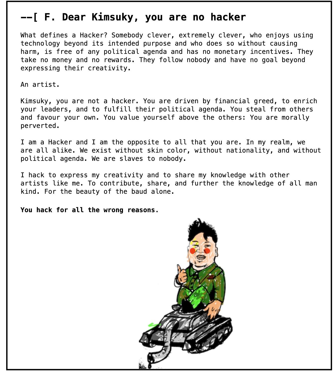 The authors differentiated their hacking from that of a suspected APT group in the Phrack article, including a mocking illustration of North Korean leader Kim Jong Un.