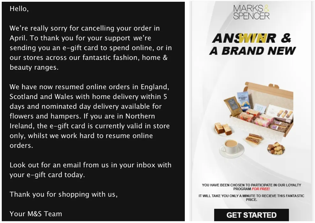 Figure 1: The left image shows the legitimate outreach email from the retail brand and the screenshot on the right shows a scam email.