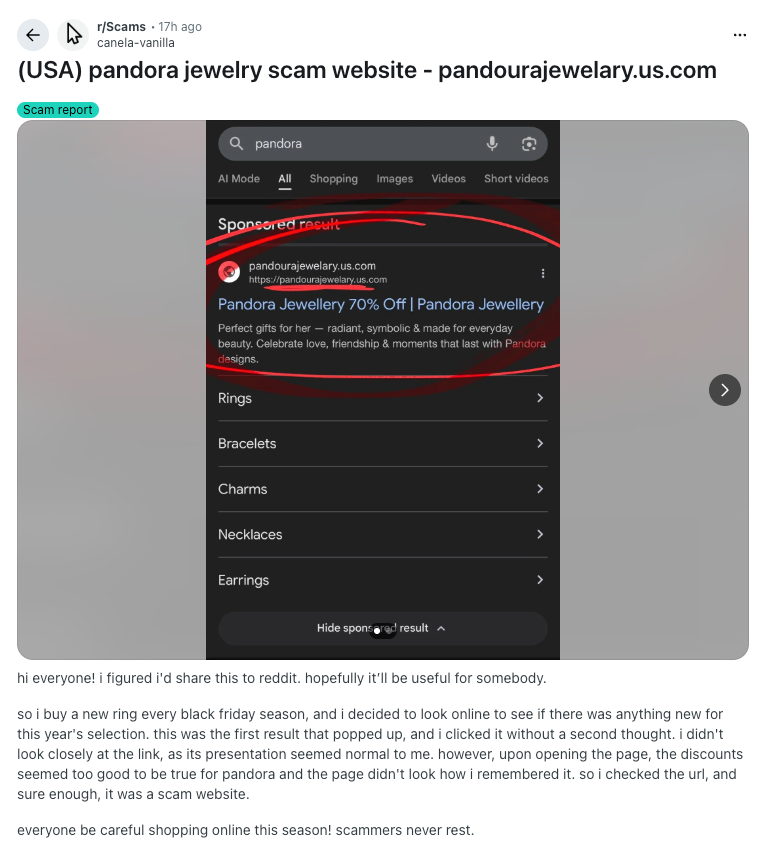 Figure 2: Image of a fake website piggybacking off the Pandora jewelry brand appearing as sponsored content. Note the typographical errors.