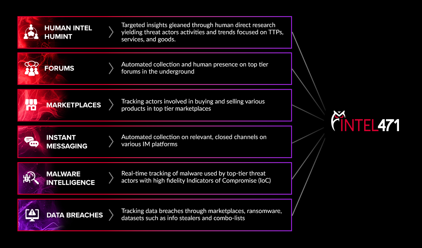 Intel 471βs CTI sources include covert sources, cybercrime forums, messaging platforms, marketplaces, malware tracking, infostealer logs, data breach logs, and more.