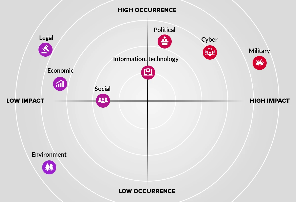 Geopolitical risk at a glance: Intel 471 plots faux geopolitical event categories onto a risk radar, based on the relative occurrence plus its impact across the reporting period.